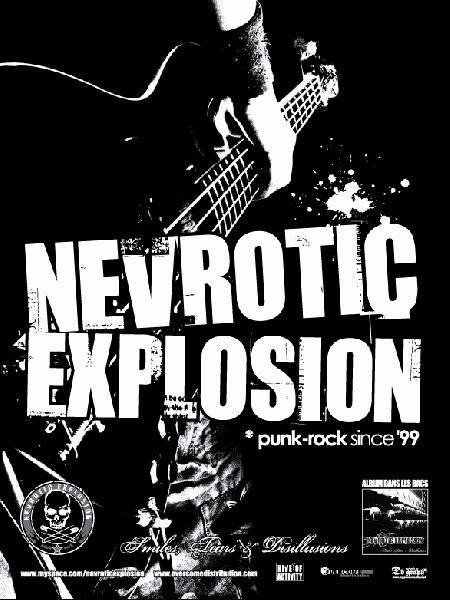 NEVROTIC EXPLOSION voit le jour fin 1998. Ces 5 bretons aux diverses influences musicales (reggae, Hard-core,…) se sont réunis autour d'une seule cause : le punk-rock. En 1999, la démo autoproduite 'Smoke your dreams' propulse le groupe sur le devant de le scène rock française grâce a un savant mélange de mélodie et d'énergie. En 2001, le premier album 'Project 06' sous le label rennais Mass Production permet au groupe d'obtenir la reconnaissance du public et de la critique. Avec plus de 300 concerts, le groupe tourne alors à travers la France et l'Europe (Belgique, Allemagne, Hollande, Espagne, Suisse, Irlande,...) en effectuant de prestigieuses premières parties telles que Fishbone, The Distillers, Agnostic Front, Satanic Surfers, Alpha Blondie, US Bombs, Burning Heads, Inner Terrestrials, Aqme, GBH, Poison Idea, Defiance... Encensés par la presse hexagonale, les 5 rennais nous offrent avec des textes engagés sur fond de punk-rock mélodique jamais cliché, leur vision d'un monde décadent.