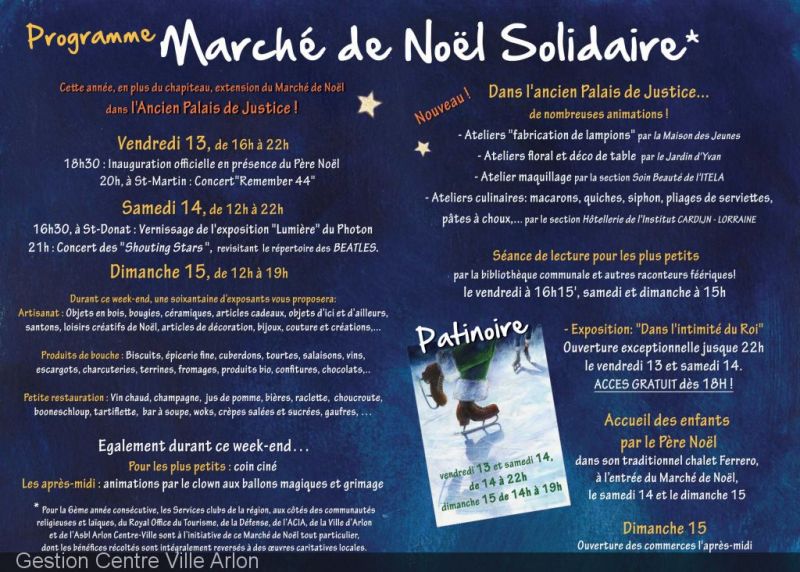 BIO Du vendredi 13 au dimanche 15 décembre, l'ASBL Gestion Centre-Ville Arlon organise un marché de noël solidaire ! Il commencera par une ignauguration officielle en présence du Père Noël, et sera suivi de concerts, expositions, vente de produits artisanaux, séances de lecture, coin cinéma, animations de clowns ... (pour plus d'informations, cliquez sur l'image ci-dessous). La nouveauté cette année : des événements sont organisés à L'Ancien Palais de Justice ! Au programme : - ateliers fabrication de lampions par la Maison des Jeunes - ateliers floral et décoration de table par Le Jardin d'Yvan - Atelier maquillage par la section soin et beauté de l'Itela - Ateliers culinaires (macarons, pliage de serviettes ...) par la section Hôtellerie de de L'Institut Cardijn-Lorraine L'exposition "Dans l'intimité du Roi" sera aussi ouverte gratuitement les vendredi 13 et samedi 14 de 18h à 22h ! ARCHIVE: CONCERTS Vive la saison des fêtes !, le dimanche 15/12/2013 (Le Palais) Vive la saison des fêtes !, le vendredi 13/12/2013 (Le Palais) |